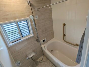 ベージュを基調としたあたたかい浴室に😊