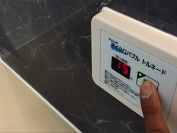 マイクロバブルトルネードのスイッチです。ボタン一つで15分間作動します、お掃除も1~2ヶ月一度でジャバをポチャンと入れていただき、このボタンを揺らぎジェットで押すだけ。