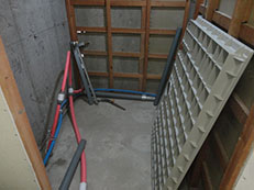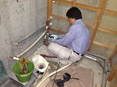 新しいユニットバスの配管基準位置に合うように給排水配管工事をしています。