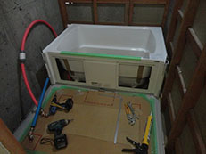 ユニットバスリフォーム組立中です。ユニットバス床パネルの設置後浴槽を設置していきます。