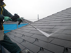 カラーベスト屋根高圧洗浄中です、丁寧によごれを確実に落としていきます。
