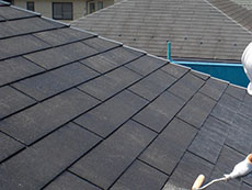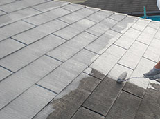 屋根塗装中です、4回目ガイナ上塗り中です。今回は合計4回塗りなので本来の色に深みが増すことは確実です。塗布量をきっちり守りながら丁寧に塗っていきます。ガイナの効果を確実に発揮できます。